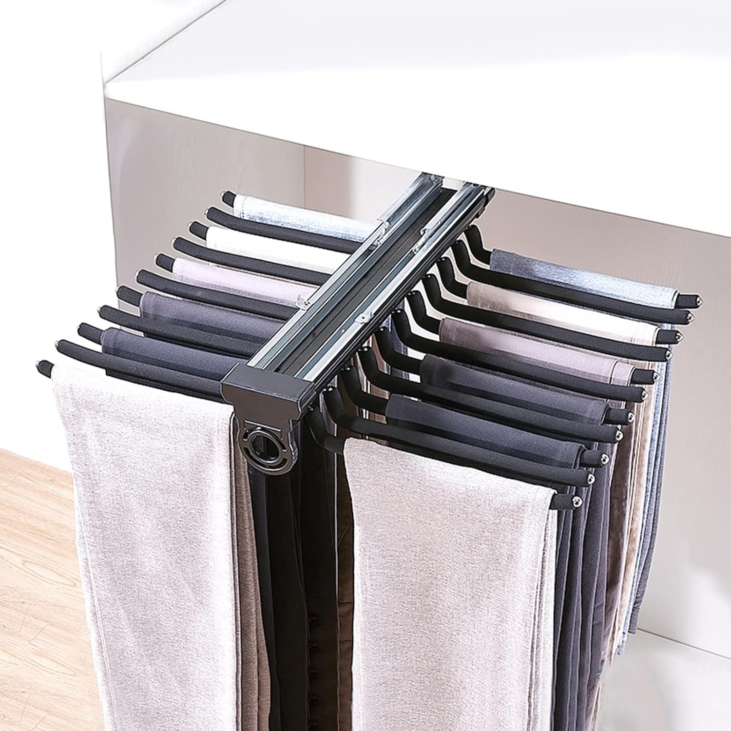 Feature:◆ The pull out trousers rack with damping buffer bottom:double row of three Mute Pulley, provides cushioned rebound effect for better silent mute;◆ Wrapped in flocked materials Stainless steel solid steel hanger bar: to help maintain the shape of the pants without wrinkles, feeling comfortable soft.◆ Environmentally-friendly ABS base: no peculiar smell, thick base, strong bearing capacity◆ Protective rubber pad: reduce friction, firmly jam the clothes rail, silent◆ Thickened body: high strength, toughness, and corrosion resistance.◆ Stainless steel solid steel ball: round head design, safer.Specification:Product color: beige,black,grayMaterial: aluminum alloy base+ABSProduct Dimensions: 45.8x58.8cm/18.03x23.15inWeight: 3.9kgRod-to-rod distance: 2.7cm/1.06"Number of rods: 22Cabinet width requirements (internal width): >60CM/23.6inCabinet depth requirements (internal depth): ≥ 48CM/18.89inInstallation method: top mountScope of application: suitable for all wooden wardrobesPackage Includes:1 x top Install trousers rack,with screws▲ If you have any questions, please feel free to contact us, we will reply you within 24 hours and provide you with the best service!