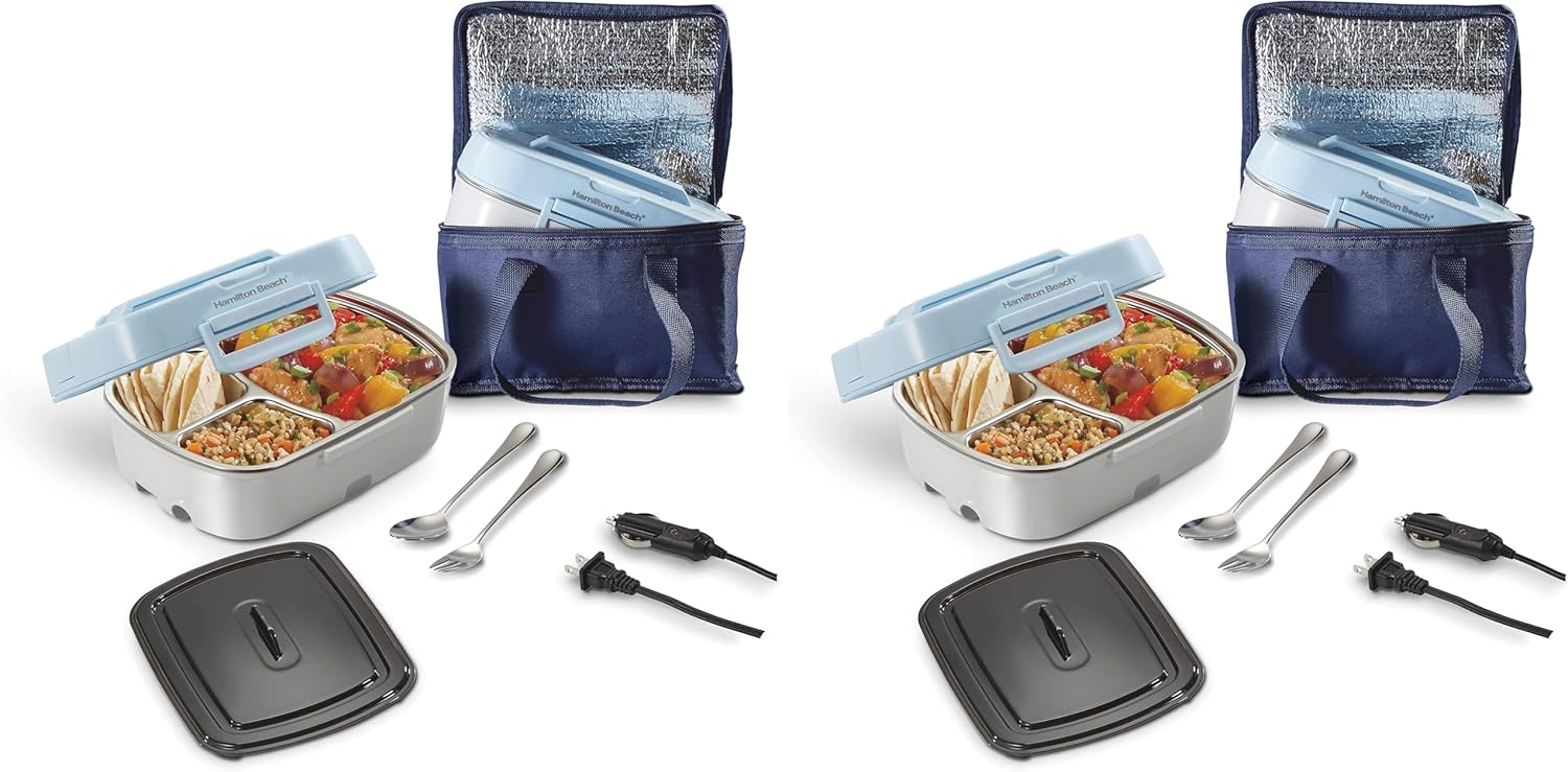 Enjoy a hot meal anywhere with the Hamilton Beach® Lunch 'N Go Portable Food Warmer. It comes with a 12 volt car adapter, a 120 volt plug for the office, an insulated bag, utensils, a food tray with 3 compartments, lid, storage area and handles.