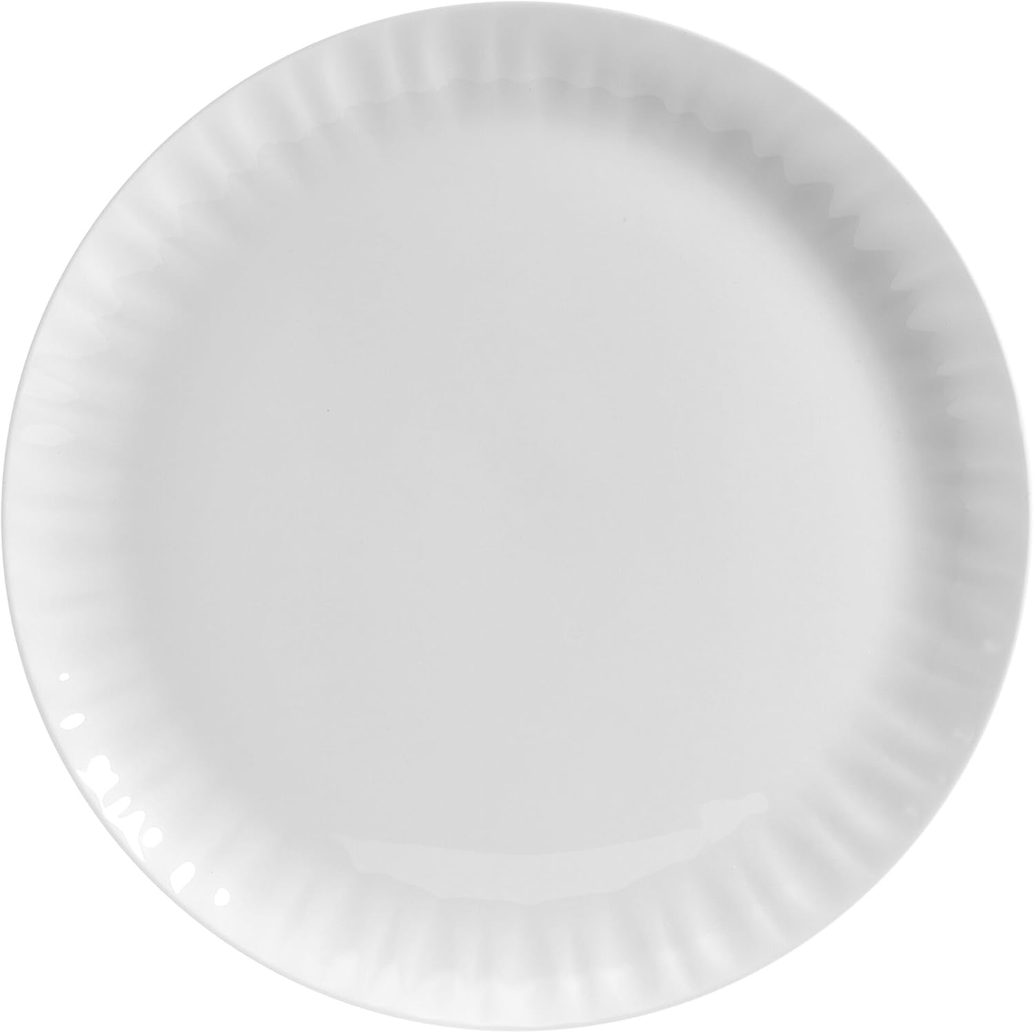 Modern and elegant, this Franklyn 12-Piece Dinnerware Set by Mikasa features contemporary shapes and an eye-catching line design around the rims. Beautifully crafted of chip-resistant, high-quality Bone china, this basic white collection is perfect for casual or formal dining and complements any flatware or stemware. 12-piece set, service for 4, includes 4 each of: 10.3-inch dinner plate, 8.3-inch salad plate, and a 6-inch all-purpose bowl with an 18-fluid ounce capacity. Microwave and dishwasher safe. .