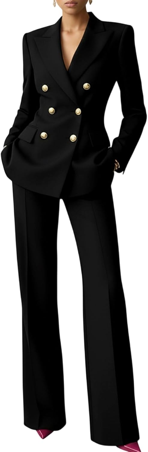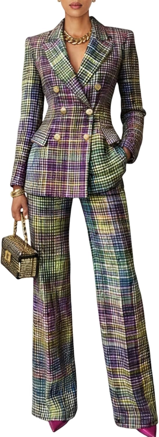 Tcremisa Womens Plaid Pant Suits 2 Piece Set Business Casual Outfits Double Breasted Blazer Set Formal Office Clothing